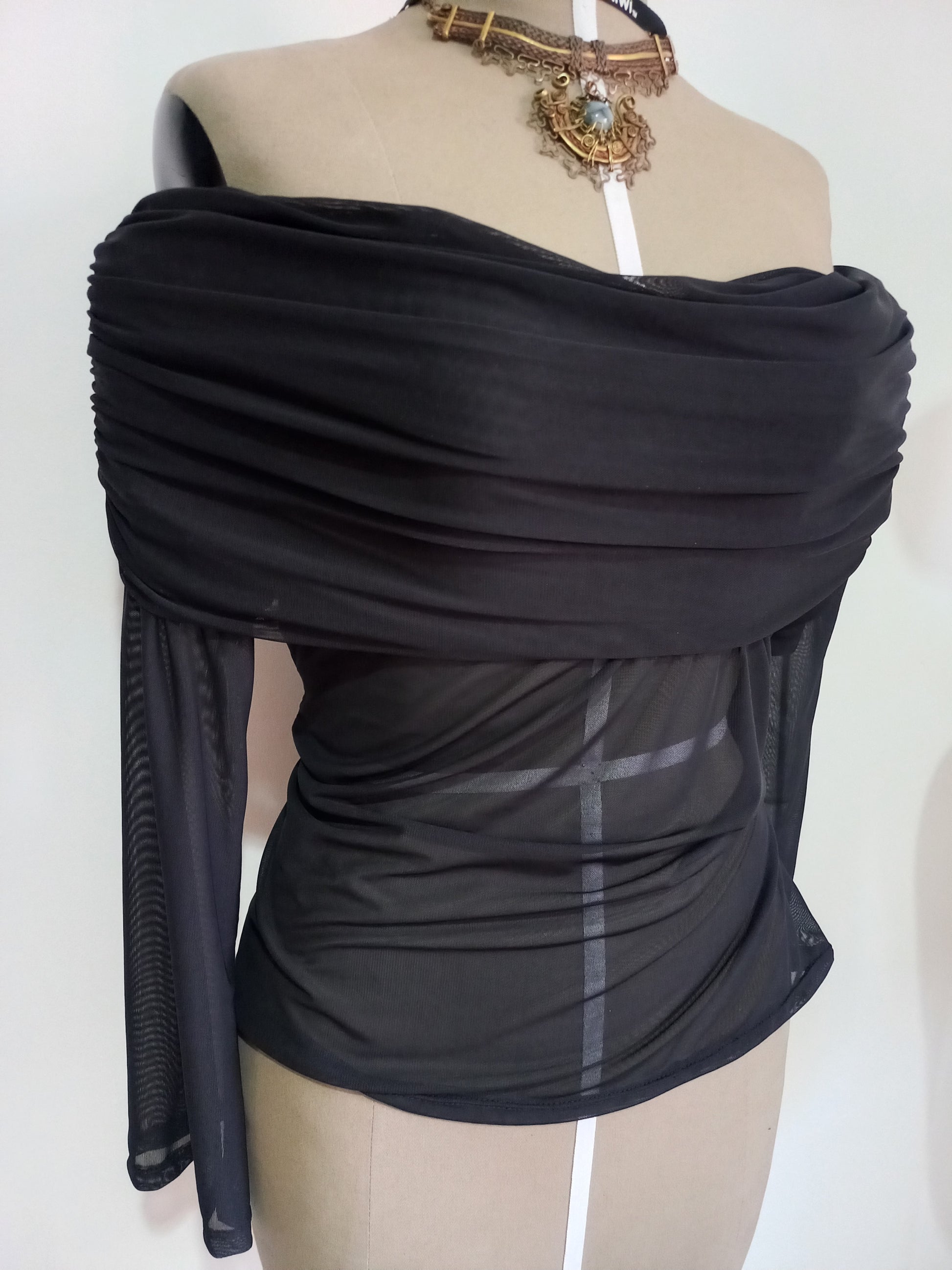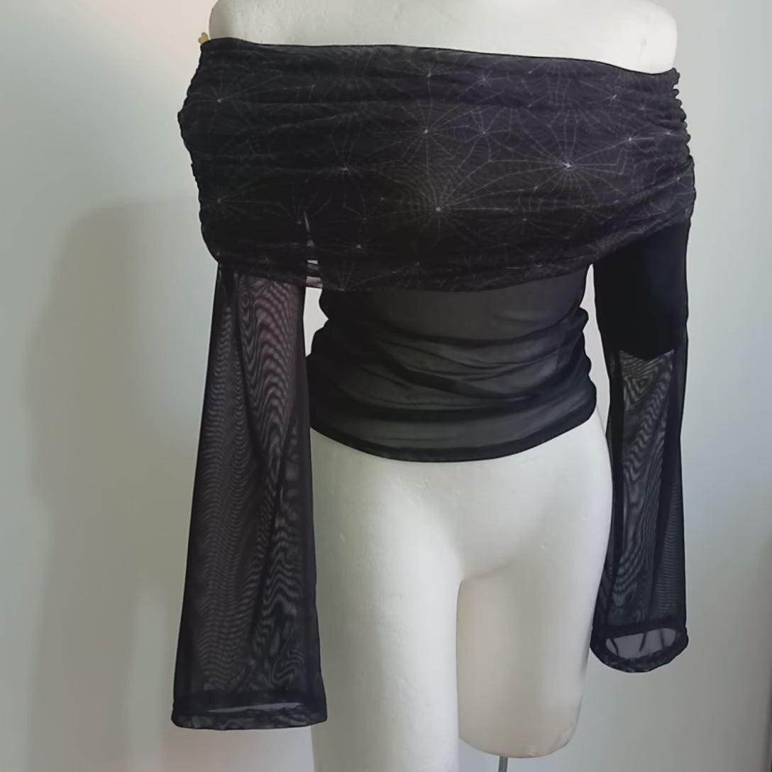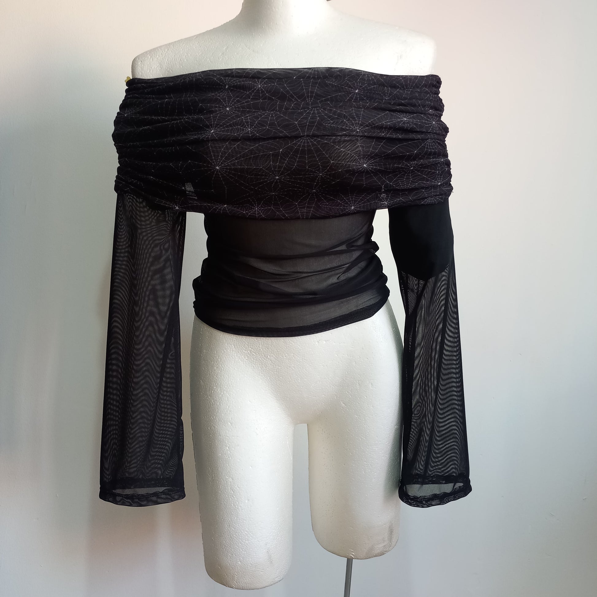 Nuestro top Nyx con escote bardot o barco es ideal para un toque romántico, brujil y fresco! Diseñado en mesh calidad premium con estampado arácnido o si lo prefieres negro liso!